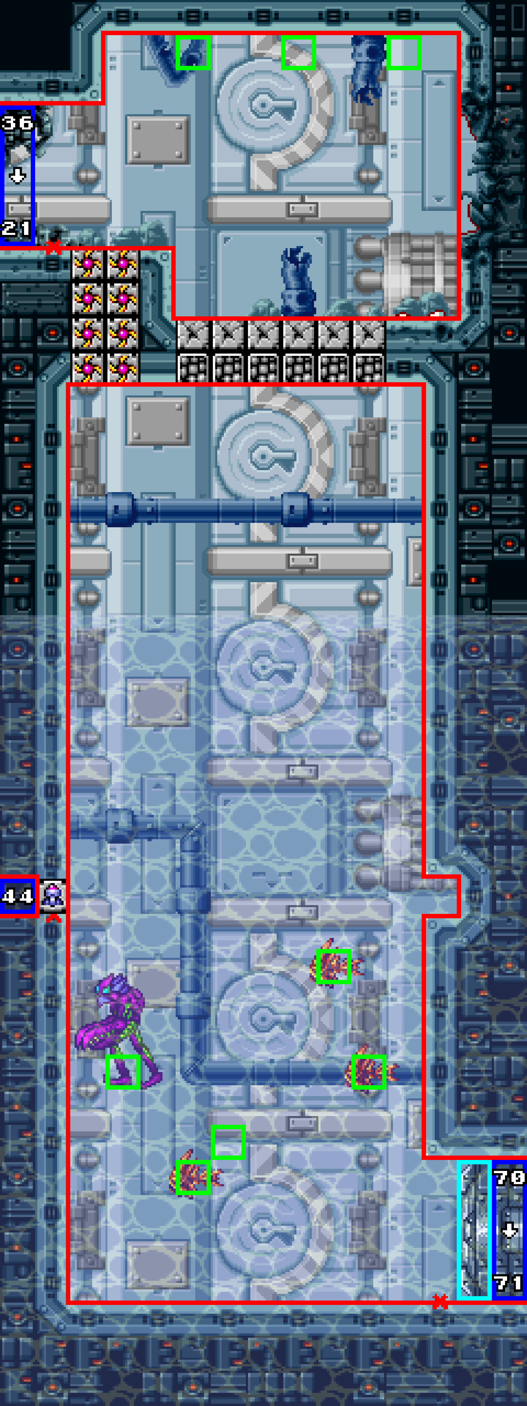 Flooded Tower Metadata Internal Room ID: 0x2D Adjacent Rooms: Ruined Corridor (top left) Mini-Fridge (middle left) Zebesian Waters (bottom right) Enemies Small Skultera Underwater Ground Zebesian